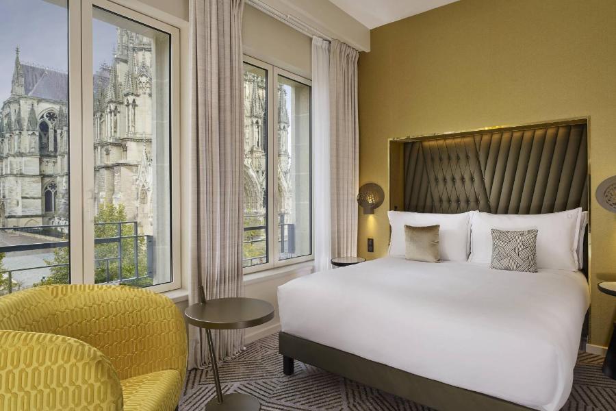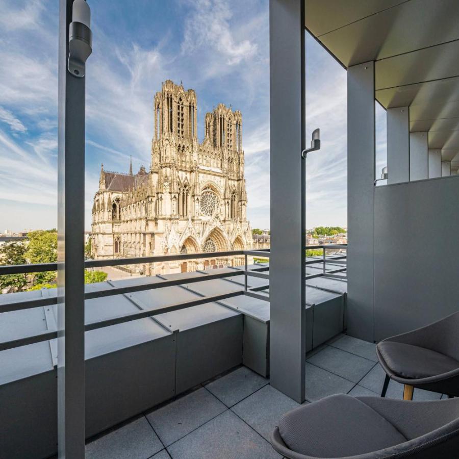 L’hôtel propose 89 chambres et suites, déclinées en plusieurs catégories, dont certaines offrent une vue imprenable sur la cathédrale. Les teintes douces et naturelles, inspirées du terroir champenois, participent à l’ambiance feutrée des lieux. Lignes épurées, textiles raffinés et touches de bois créent une atmosphère propice à la détente. Chaque espace est pensé pour le bien-être, avec des équipements haut de gamme, une literie de qualité et des salles de bains élégantes, où peignoirs moelleux et articles de toilette soigneusement sélectionnés prolongent l’expérience sensorielle.